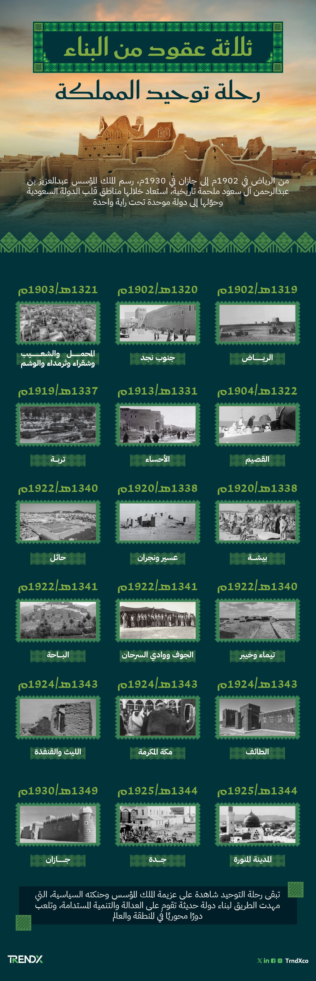 بدأت رحلة توحيد المملكة العربية السعودية عام 1902م باستعادة الرياض، وانتهت عام 1930م بضم جازان.