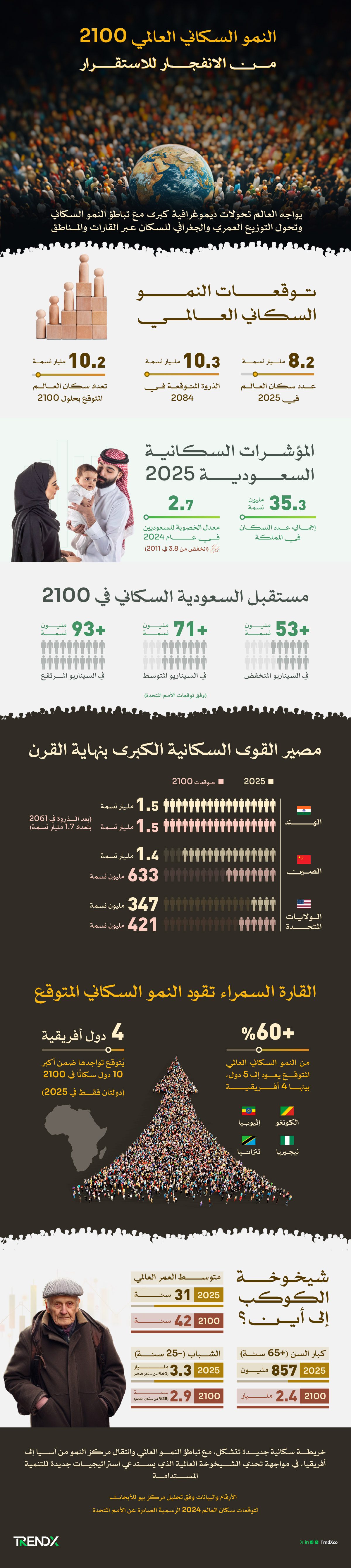 تتصدر أفريقيا النمو المستقبلي بينما تواجه الصين تراجعًا حادًا في عدد سكانها، فيما يشهد العالم شيخوخة متسارعة مع تضاعف أعداد كبار السن وتراجع الشباب، مما يعيد تشكيل الخريطة الاقتصادية والاجتماعية عالميًا.