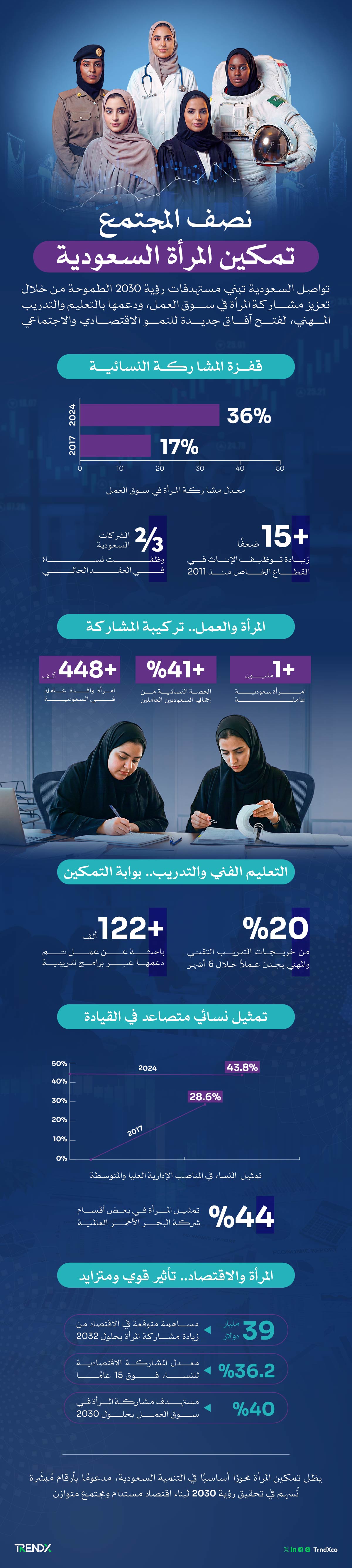 تشهد السعودية تقدمًا قويًا في تمكين المرأة السعودية، حيث بلغت نسبة مشاركتها في سوق العمل نحو 36% خلال عام 2024، متجاوزة مستهدفات رؤية 2030.