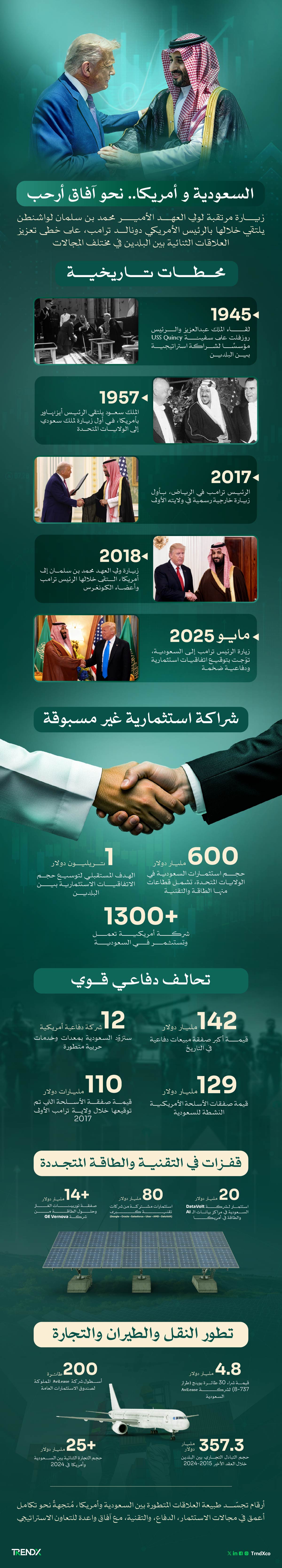تشهد العلاقات السعودية-الأمريكية ازدهارًا مستمرًا، مع استثمارات سعودية ضخمة تفوق 600 مليار دولار، وصفقات دفاعية وتكنولوجية متطورة، مما يعكس عمق الشراكة الاقتصادية والاستراتيجية التي ترتبط برؤية مشتركة للنمو والتعاون المستدام.