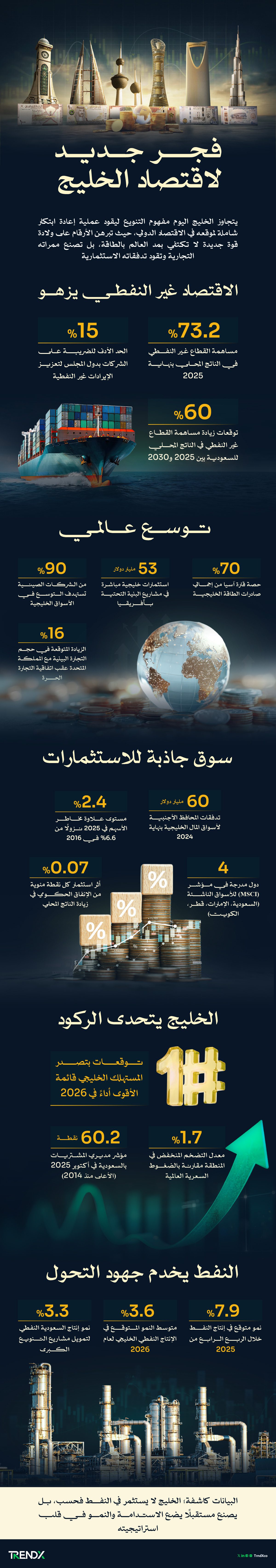 يسجل اقتصاد دول مجلس التعاون الخليجي تحولًا تاريخيًا بفك ارتباط نموه بتقلبات أسعار الطاقة، حيث قفزت مساهمة القطاعات غير النفطية لتشكل 73.2% من الناتج المحلي الإجمالي.