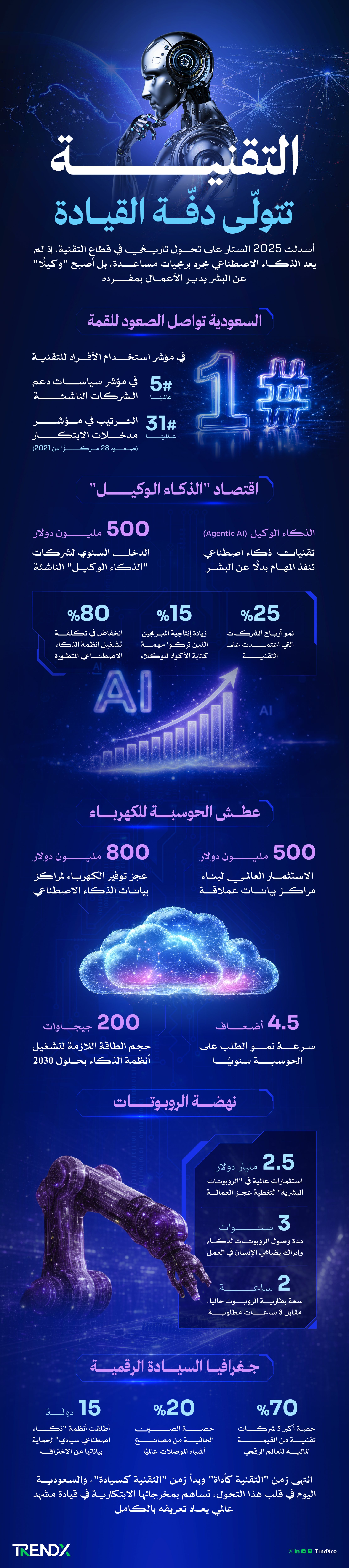 وبينما دخلت الروبوتات البشرية خطوط الإنتاج باستثمارات مليارية، ظل تركز القوة التقنية بيد خمس شركات عملاقة تستحوذ على 70% من القيمة السوقية العالمية، ما دفع الدول لتبني استراتيجيات "الذكاء السيادي" لضمان استقلالها الوطني في عالم باتت تحكمه الخوارزميات.