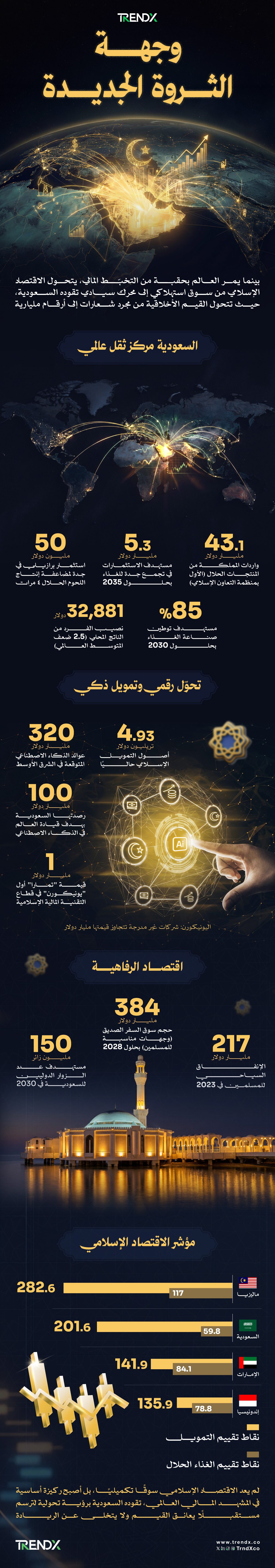 وفي حين ينمو الإنفاق السياحي بنسبة 43.2% ليصل إلى 217 مليار دولار، يرسخ مؤشر الاقتصاد الإسلامي مكانة السعودية في المركز الثاني عالميًا من حيث كفاءة بيئة الأعمال والابتكار.