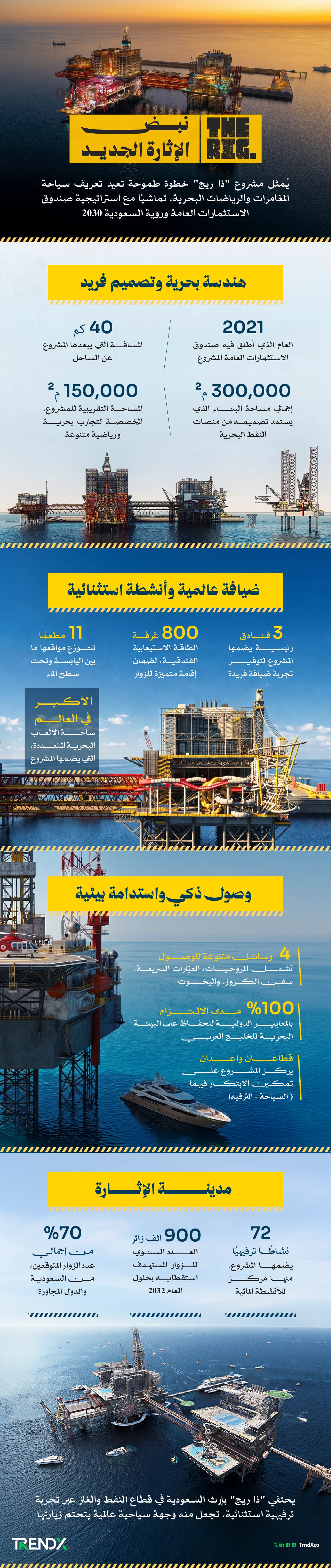 يُعد مشروع "ذا ريج" (THE RIG) نموذجًا مبتكرًا في قطاع السياحة العالمي، حيث يستلهم تصميمه من منصات النفط البحرية ليحول إرث السعودية العريق في قطاع الطاقة إلى وجهة ترفيهية استثنائية.
